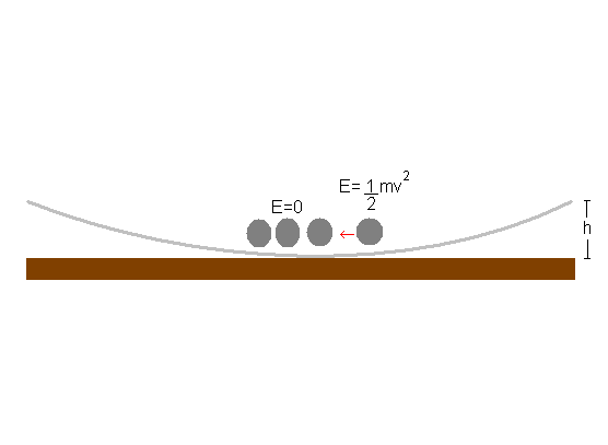 When the steel ball is at rest at the top of the ramp, it has zero kinetic energy, but it has potential energy that is equal to its mass multiplied by the height above the bottom of the ramp, multiplied by the acceleration due to gravity (E=mgh). The balls at the bottom of the ramp have zero kinetic energy and zero potential energy.